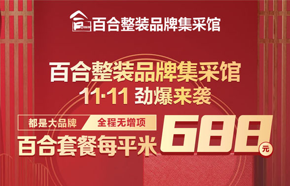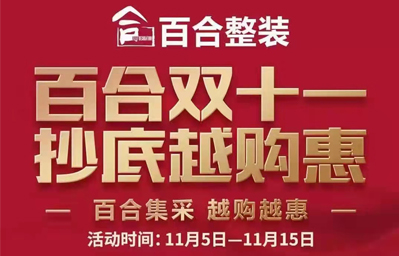 【百】百合雙十一 抄底越購(gòu)惠 【合】自主工人 品質(zhì)保障 【裝】自營(yíng)主材 整裝集采 【飾】主材拼單 越購(gòu)越惠 11 月5日至15日典石廣場(chǎng)期待您的光臨...
